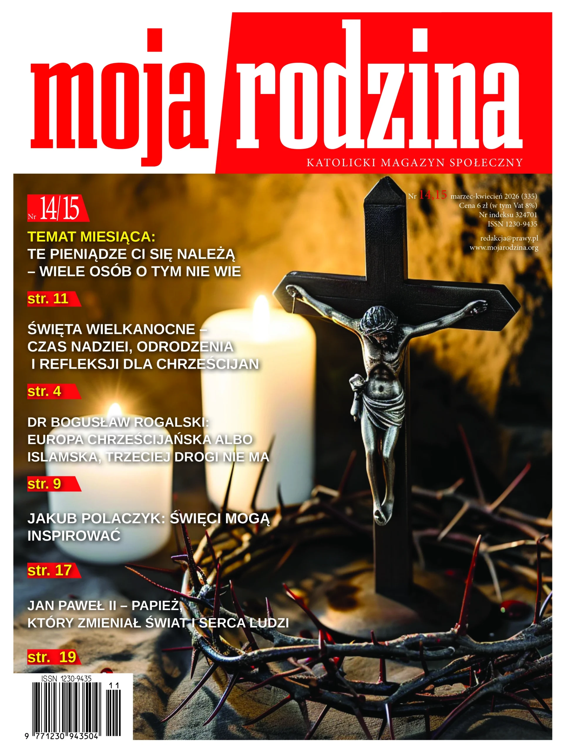 Numer 3,4/2026 otwiera artykuł napisany przez Agnieszkę Pecherzewską pt. „Święta Wielkanocne – czas nadziei, odrodzenia i refleksji dla chrześcijan”. Następnie Michał Strużyk, Halina Molka i Jakub Zgierski piszą o zdrowiu. Dr Bogusław Rogalski przedstawia mocną diagnozę w artykule „Europa chrześcijańska albo islamska – trzeciej drogi nie ma”. Gościem numeru jest znany polski kompozytor Jakub Polaczyk. Rozmowę przeprowadzili Aleksandra i Romuald Greissowie. W dziale prawo ponownie pojawia się tekst adw. Katarzyny Stopińskiej „Impreza po alkoholu na posterunku”. Iwona Świerkula kontynuuje swój cykl, tym razem pisząc o „Paradoksach w życiu św. Bartolo Longo”. W rocznicę śmierci Papieża Jana Pawła II Agnieszka Pęcherzewska przypomina Ojca świętego w artykule „Papież, który zmieniał świat i serca ludzi”. W czasopiśmie nie zabrakło też tematyki politycznej. Iwona Galińska pisze o napięciach między Donaldem Tuskiem a Karolem Nawrockim. Artykułem numeru jest analiza dr. Mariana Apostoła „Europejska Polityka Obronna – i co dalej?”. Dr Marta Moldovan-Cywińska przedstawia poruszającą historię rumuńskiej rodziny. Pokazuje ich codzienność oraz wskazuje rolę międzypokoleniowych więzi. Agnieszka Malinowska wspomina Papieża Franciszka, a całość kończą trzy felietony: Zuzanny Śliwy, Pawła Szyllera i Stanisława Michalkiewicza.
